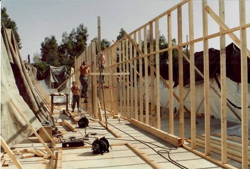 Die Holzriegelbauweise zeigt eine "finnische Nobelbaracke" mit Zentralheizung ... wurden damals erst Ende Sommer geliefert ... und wir Pioniere hatten dann geringfügig verlängerte Arbeitszeiten um schnell wetterfest zu werden! ... 0600 bis 1800 Arbeitszeit im Camp ... war wohl ein paar Tage auf der Watchlist als ZgKdt bei meinen Pi-Hämmern.... Unter Beratung meiner Bauleiter, Tischler und Zimmerer haben wir dann die Bauweise adaptiert: Nur Riegelkonstruktion, Außenwände und Dach-Prismenbleche unter Weglassen der gesamten Trockenbautätigkeiten innen. Wir waren dreimal so schnell wie die Finnen - und vorm ersten Regen dicht im Gegensatz zu zwei finnische Aquarien im Camp Ziouane!!! Pioniere wie immer!