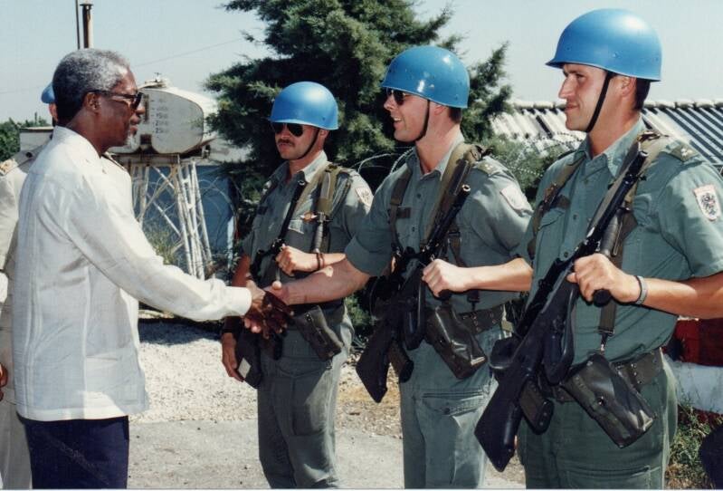 Kofi Annan, dahinter MGen J.C. Kosters und der 14/50 bei der Meldung an Kofi Annan