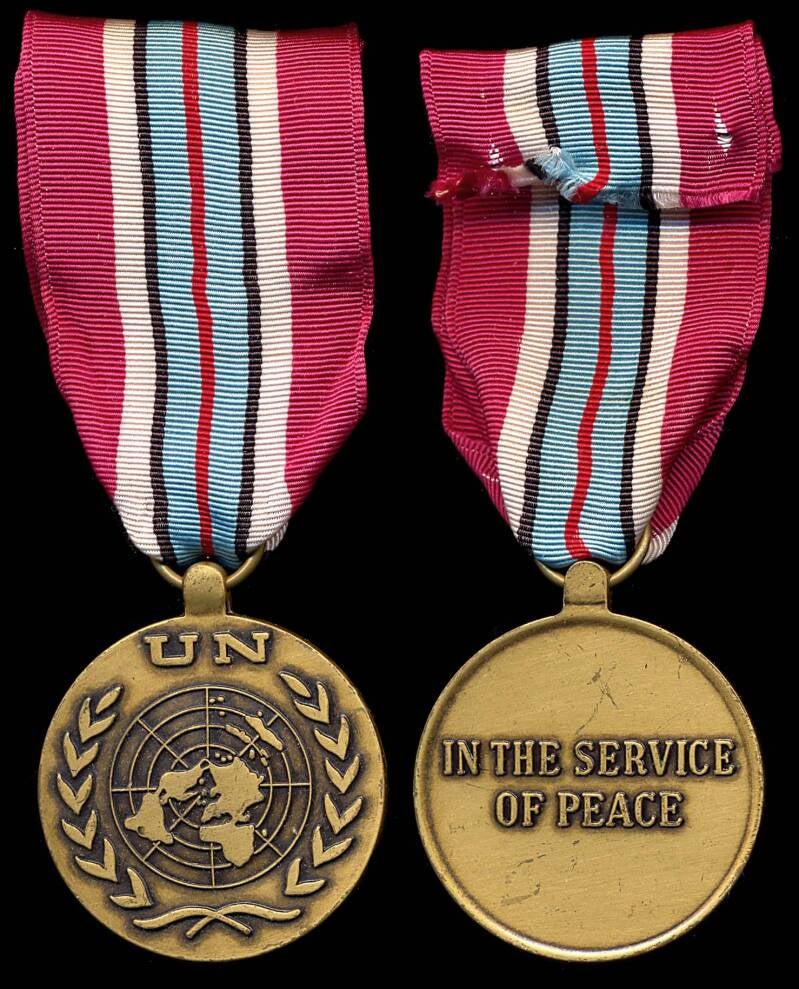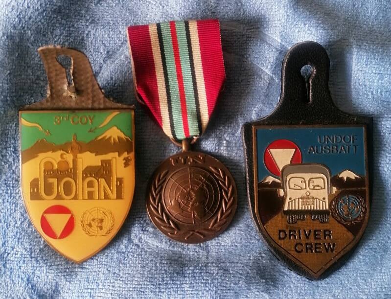 Links: Kamerad Gottfied Neubauer: "Dieses Abzeichen haben nur wenige UN_Soldaten bekommen.AUSCOY war die Ablöse für die Peruaner (Nationas Unidas Bataillion PERU). Eine KP hat den BaonsStreifen der Peruaner übernommen.Ich war damals( 1975) Kdt des südlichsten StPktes named Pos 60,"