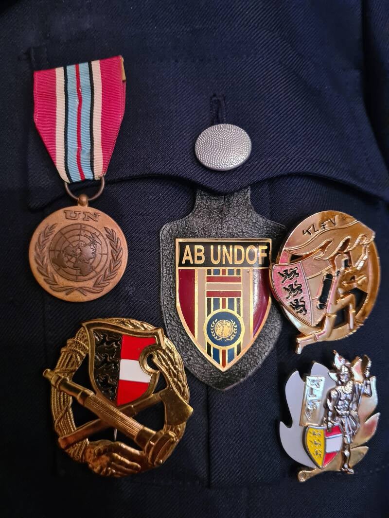 Unten: Die beachtliche Sammlung der Auszeichnungen seiner Friedenseinsätze des Kameraden Didi Baumholzer