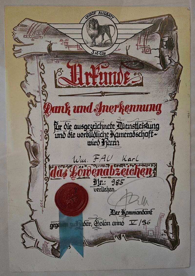 Eine interessante Urkunde. Da das Gesetz zur Entsendung auf den Golan noch nicht ratifizert war mußten die Kameraden der "First Mission" offiziell abrüsten und wurden mit dieser Urkunde entsendet.