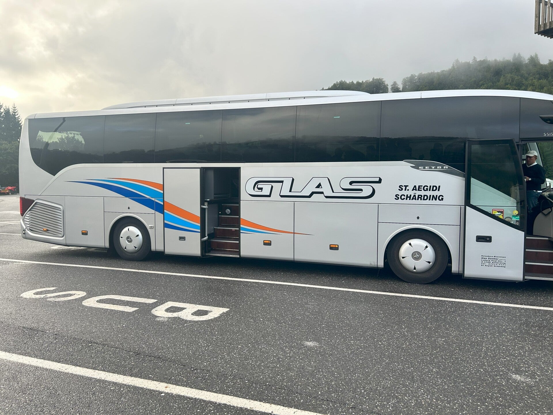 frühmorgens mit der Fahrt in einem Reisebus der Fa. Glas von Linz nach